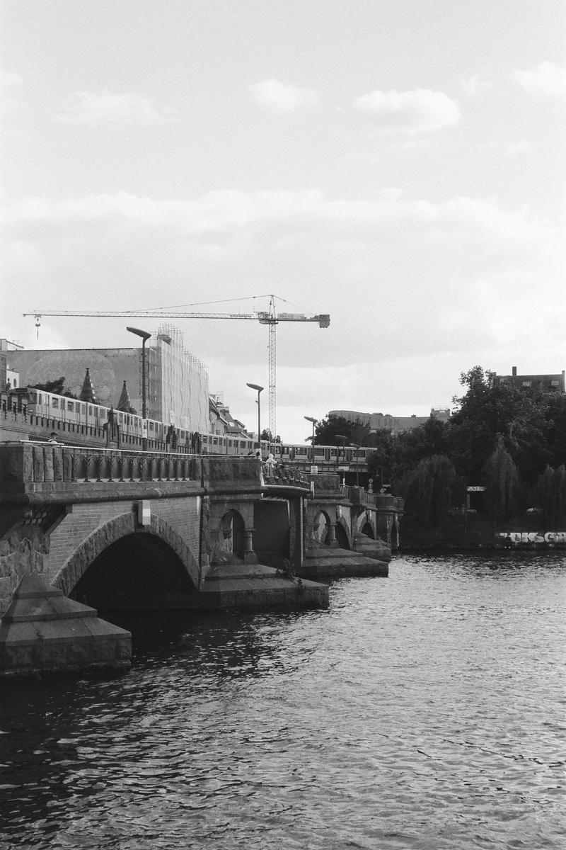 Traain crossing the Oberbaumbrücke/Oberbaum Bridge in Berlin. Shot on Lomography Lady Grey with Leica C3.